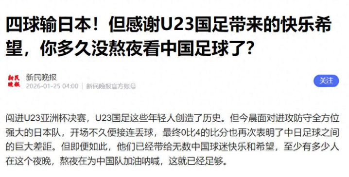 但这一次,中国U23国足被日本打了四个,却赢得了前所未有的掌声。这背后的逻辑,就一个字:值。